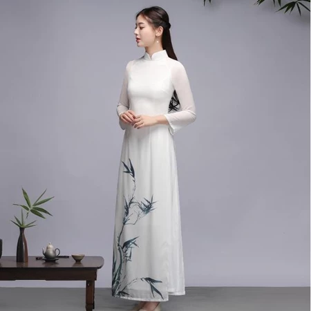 Traditional Vietnam Ao dai Women Spring Long dress Cheongsam Qipao Vintage Bamboo print Chiffon Whit